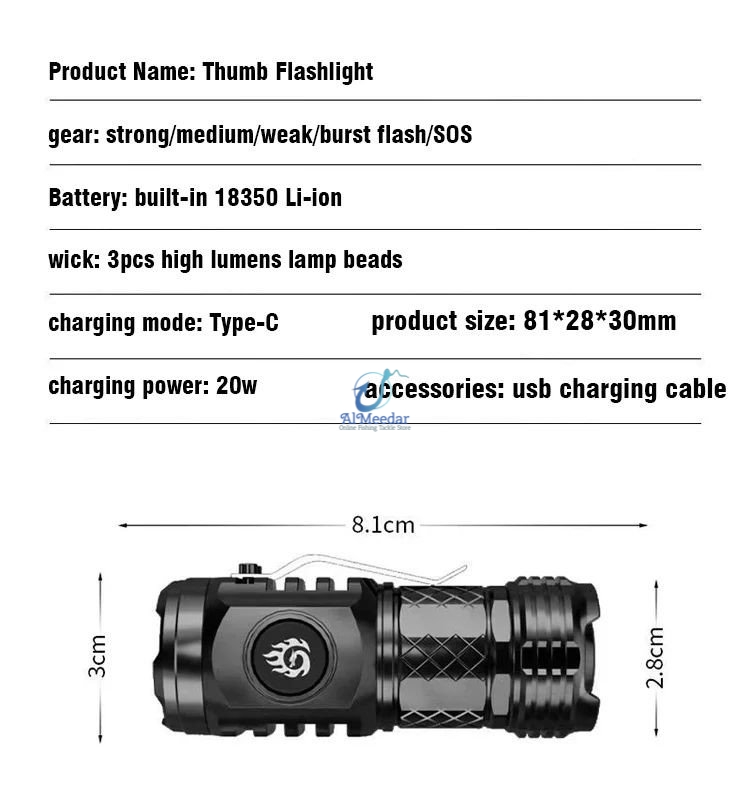 Thumb Flashlight strong power 3pcs high lumens beads USB type-c charging small and comfortable